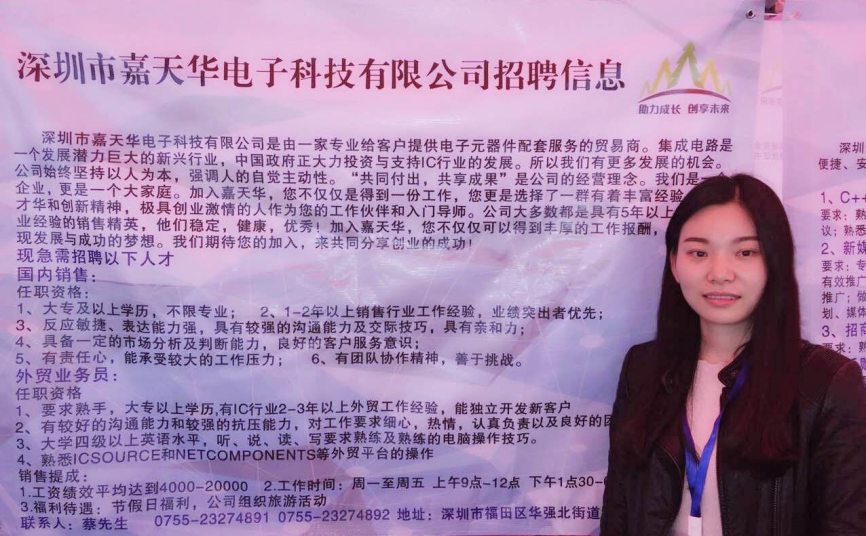 深圳市嘉天华电子科技有限公司联合华强集团于深圳华强北万商电脑城举行大型公益招聘会,参加招聘企业140家。由于业务范围的急剧扩张,现诚邀各行各业精英的加入。公司始终坚持以人为本,强调人的自觉主动性。“共同付出,共享成果”是公司的经营理念。同事间和睦相处,我们是一个企业,更是一个大家庭。加入嘉天华,您不仅仅是得到一份工作,您更是选择了一群有着丰富经验,富有才华和创新精神,极具创业激情的人作为您的工作伙伴和入门导师。公司大多数都是具有5年以上丰富行业经验的销售精英,他们稳定,健康,优秀!加入嘉天华,您不仅仅可以得到丰厚的工作报酬,更可以实现发展与成功的梦想。我们期待您的加入,来共同分享创业的成功!